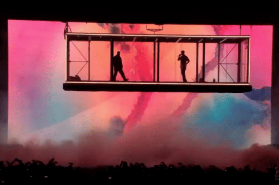 Bersama Kid Cudi, Ye tampil dengan konsep yang unik dan eksperimental. Mereka berada di dalam kotak kaca transparan yang menggantung di atas panggung. Visual ini memberikan kesan rapuh sekaligus intens, seolah penonton bisa melihat langsung setiap ekspresi dan gerakan mereka. Ditambah dengan efek api yang menyala di belakang, suasana konser menjadi semakin dramatis. Meskipun hanya tampil satu malam, konsep ini meninggalkan kesan yang kuat. -