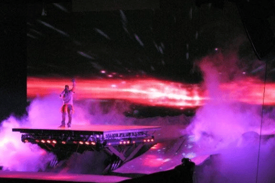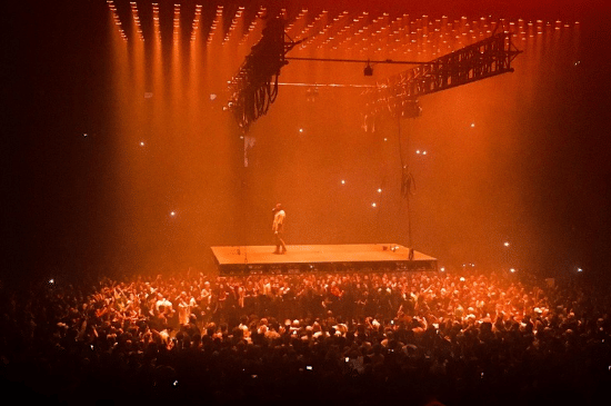 Tur ini menghadirkan konsep yang sederhana namun revolusioner: panggung yang menggantung di atas penonton. Ye tampil sambil “melayang” dan bergerak di atas kepala ribuan fans. Interaksi yang tercipta terasa jauh lebih dekat dan intens dibandingkan konser biasa. Penonton di bawah panggung merasakan energi yang berbeda, seolah menjadi bagian langsung dari pertunjukan. Desain ini kemudian banyak menginspirasi konser-konser hip-hop modern yang mengedepankan interaksi dan energi crowd. -