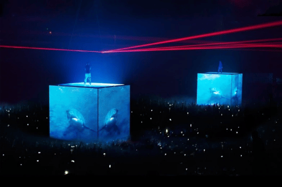 Dalam tur kolaborasinya bersama Jay-Z, Ye tampil di atas kubus LED raksasa yang dapat berubah-ubah visualnya. Kubus tersebut menjadi pusat perhatian karena mampu menampilkan berbagai gambar, teks, hingga animasi yang sinkron dengan lagu yang dibawakan. Meskipun secara konsep terlihat sederhana, eksekusinya sangat inovatif pada masanya. Desain ini menciptakan pengalaman visual yang dinamis sekaligus memperkuat chemistry antara dua ikon hip-hop tersebut. -