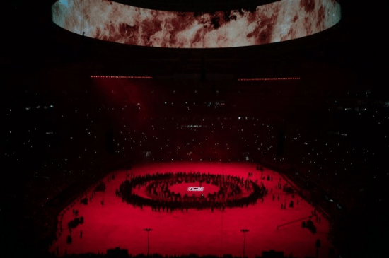Bertempat di Mercedes-Benz Stadium, Ye menghadirkan pengalaman mendengarkan album yang jauh dari kata biasa. Ia tampil sendirian di tengah arena dengan outfit serba merah, dikelilingi figur-figur misterius yang bergerak seperti ritual. Suasana terasa gelap, simbolis, dan penuh makna. Puncaknya, Ye “terangkat” ke udara, menciptakan momen visual yang sangat ikonik dan banyak dibicarakan. -