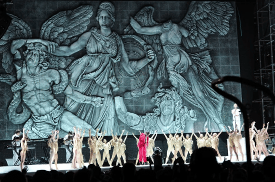 Saat tampil di Coachella, Ye menghadirkan panggung dengan nuansa artistik yang kental. Ia memadukan elemen balet, kostum dramatis, serta visual latar yang terinspirasi dari ukiran mitologi Yunani. Kehadiran penari dengan koreografi teatrikal membuat konser terasa seperti pertunjukan opera modern. Pendekatan ini menunjukkan bahwa Ye tidak hanya terinspirasi dari budaya pop, tetapi juga seni klasik yang diolah ulang menjadi sesuatu yang relevan bagi penonton masa kini. -